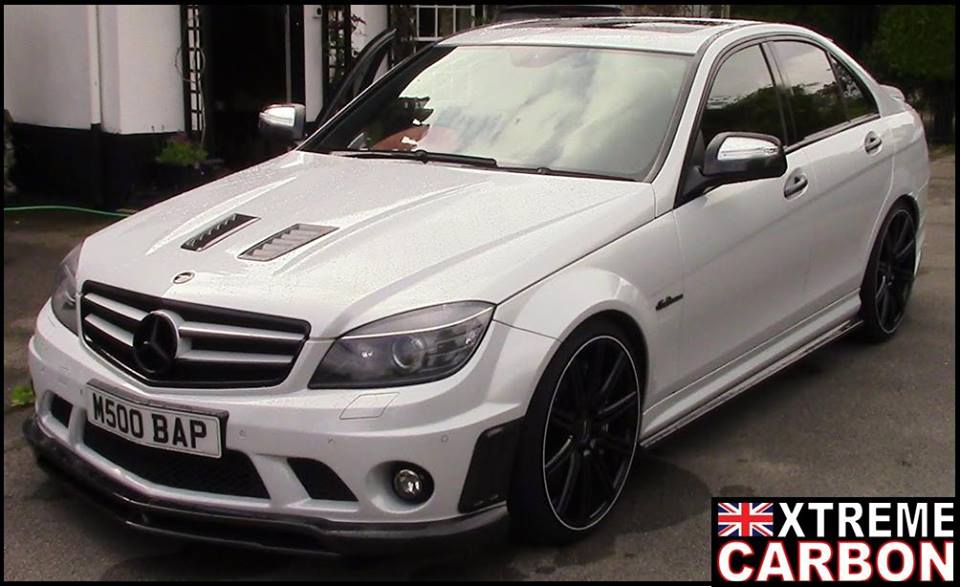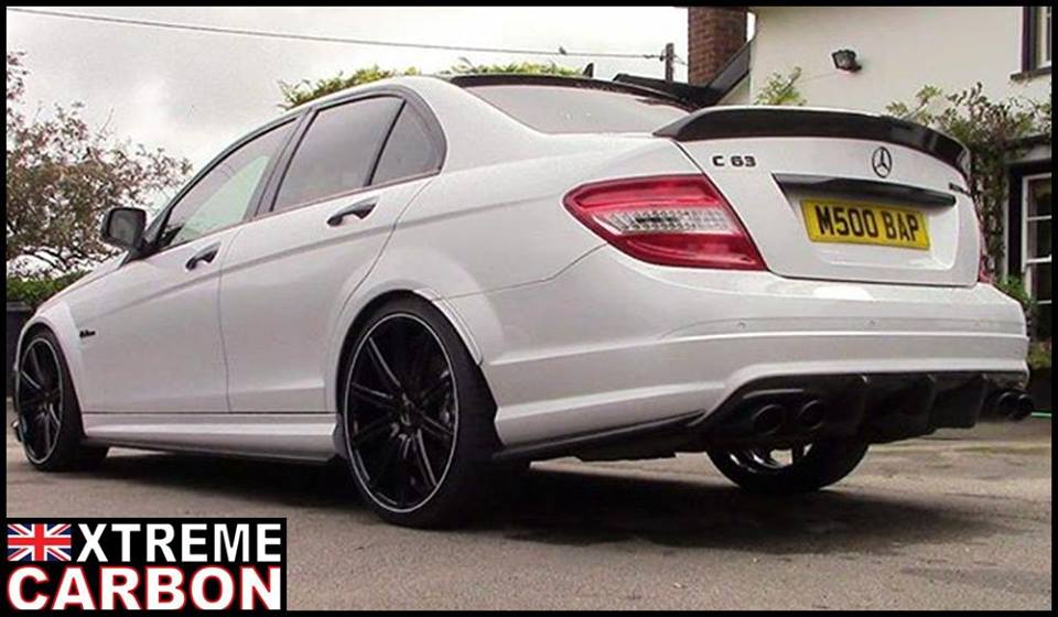 W204 C63 fitted with Xtreme Carbon C-style front lip spoiler, front bumper vents, side skirts & rear bumper extensions set, window top roof spoiler, DTM V-style boot spoiler & big fin rear diffuser